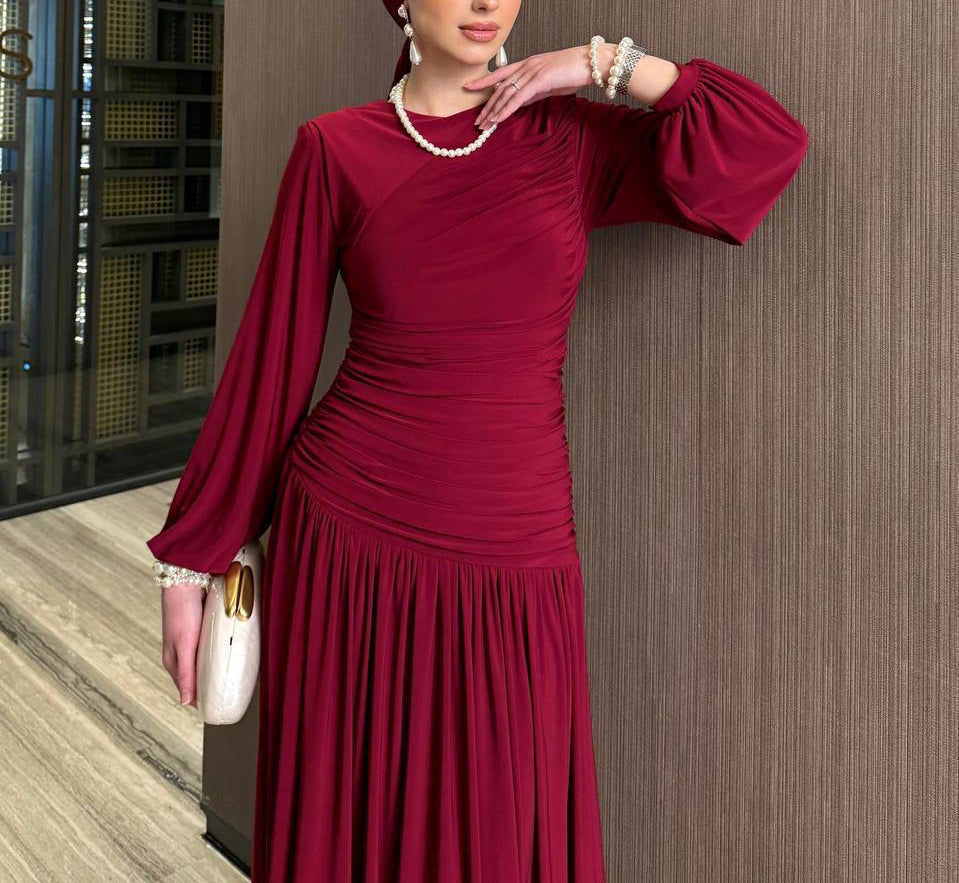 The modest round neckline and long sleeves make it perfect for day-to-night wear, while the flowing skirt ensures effortless movement and grace. Pair it with heels and a clutch for an elegant evening look, or style it with flats for a chic daytime outfit.